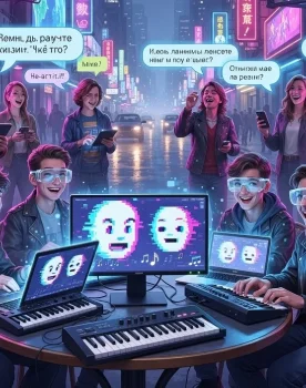 Absurdism, Cyberpunk, Music Theory Analysis, Screenplay / ScriptИсходникреалистично. реп база 3 гитариста тупо уставились в работающий ноут и за ними склонившись и касаясь их плеч 4мя руками стоит 2метровая волшебная топ модель красавица Красная Дакини с интересом наблюдая за работой искусственного интеллектареп ...