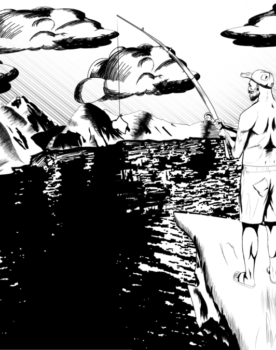 Старый тапок висит и покачивается ветерком на кусте, красная кепка лежит на песке, очки зацепленные рядом с палкой, вбитой в песок, пластмассовый белый стул, где облокотился мужчина, чья чуть-чуть горбатая спина прогибает обломанную спинку. В ...